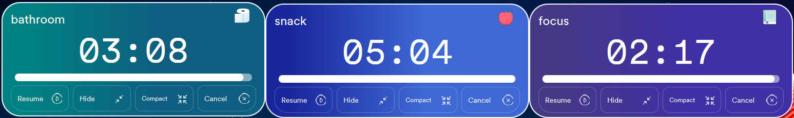 We have three themed timers: bathroom, focus, and snack.